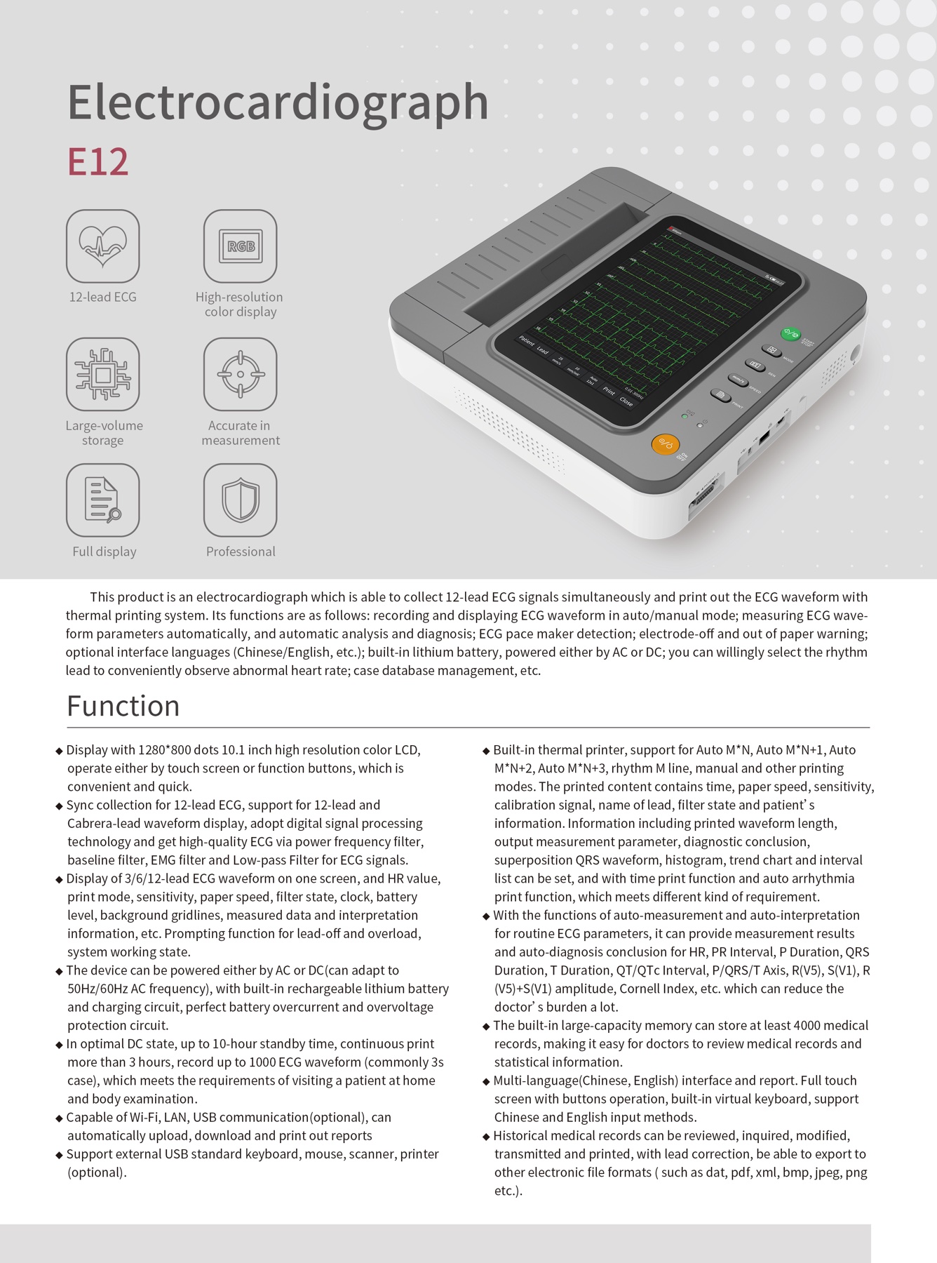 The device is an electrocardiograph which can collect 12-lead ECG signal simultaneously and print ECG waveform with thermal printing system. It features in, recording and displaying ECG waveform in auto / manual mode; measuring, analyzing and diagnosing ECG waveform parameters automatically