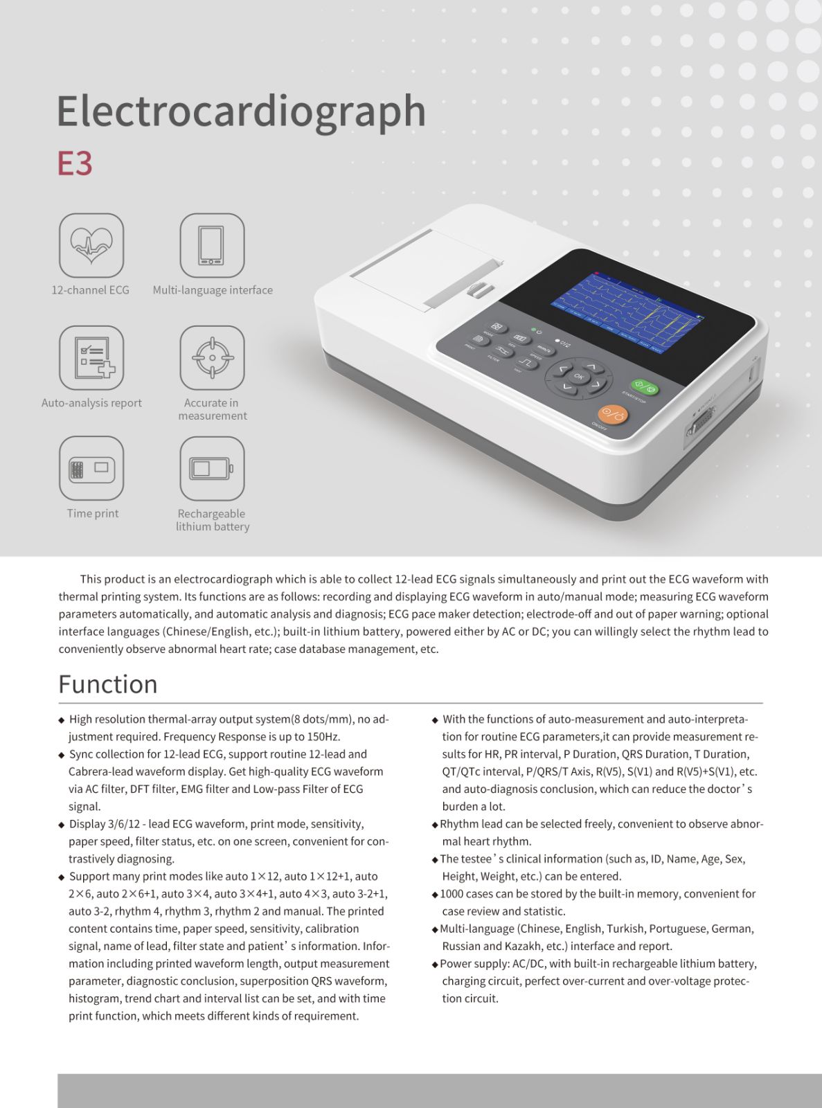 E3 is a kind of electrocardiograph, which is able to sample 12 leads ECG signals simultaneously and print out the ECG waveform with thermal printing system.